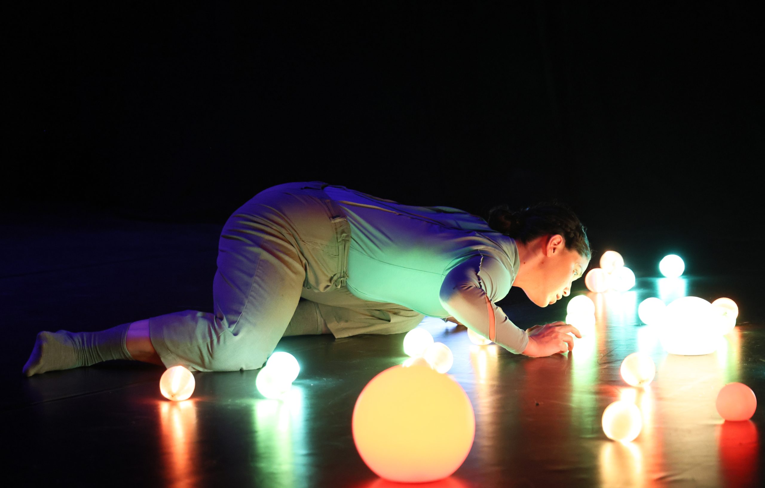 Oh My Electric Eye uses physical mechanisms of instability- spiraling, turning and falling bodies inspired by the behavior of material on the verge of black holes. It touches on the issue of physical agency, how can my physical and mental actions increase my strength and power to help me overcome outside forces, using myself and the community around me? The star map that shapes the space in Oh My Electric eye is made out of almost 30 programmable led light spheres that lay on the stage, and create an inverted unstable celestial land-scape. During the piece the electric stars transform into magical cyborg entities, prosthetic eyes that allow the dancers to regain sense of stability, reclaiming agency and sense of self, while creating legendary physical images