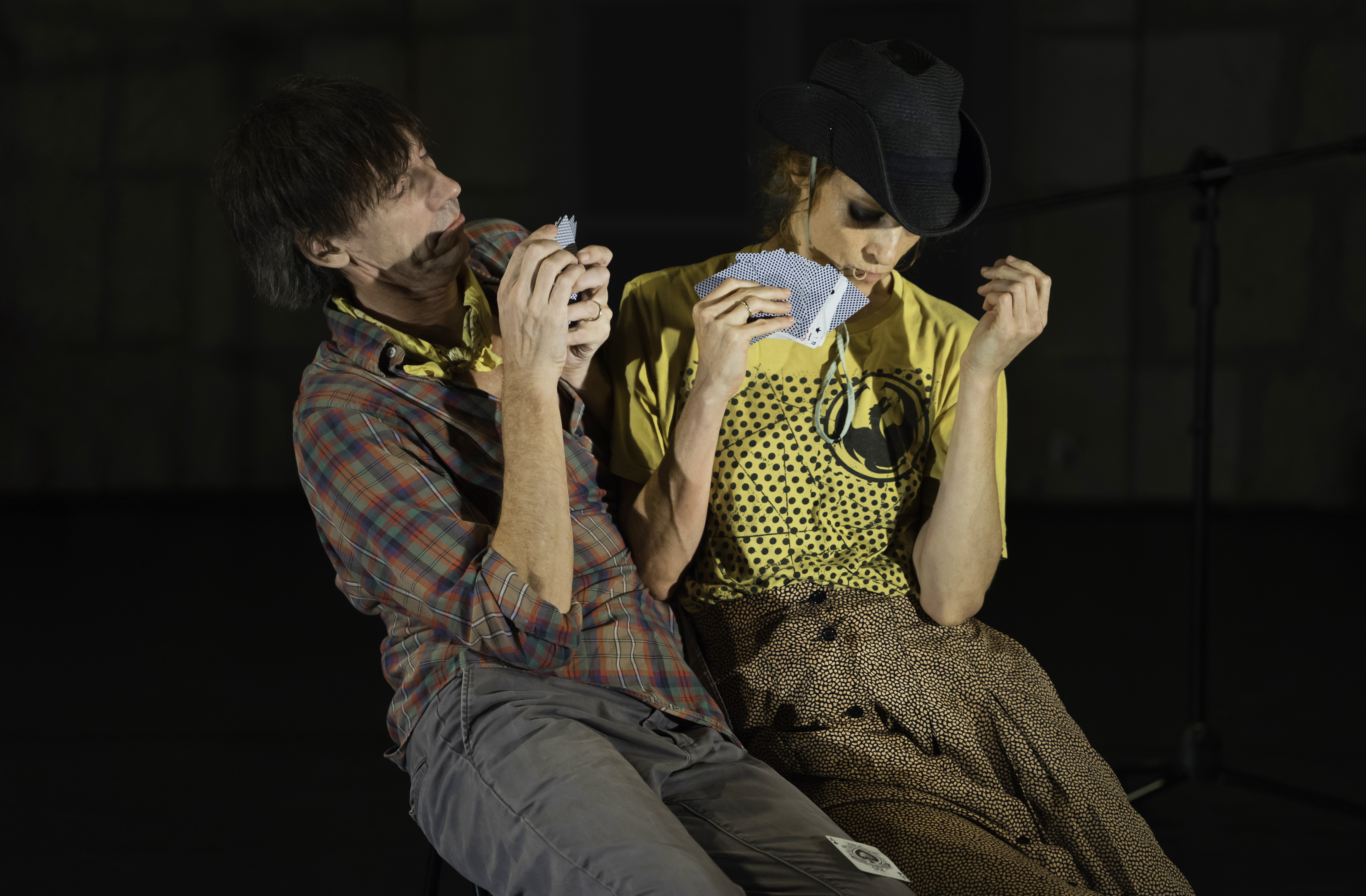 עבודתם של דיוויד קרן ותמר לם מתהווה במרחב שבין מחול, פרפורמנס וקונצרט מוסיקלי, תוך שהיא מצייתת לעיקרון מארגן שמותיר אותה פרומה ומובנית בו-זמנית. במרחב הבימתי פזורים חומרים שלקוחים מעולם דימויי אחד – חבילת קלפים ומצית, שירי פולק סנטימנטליים, גיטרה ויוקלילי, ספרים ומיקרופונים, חולצות משובצות וכובעי בוקרים, ושני פסלי כלבים דו-ממדיים. החומרים, כמו התנועה, מקיימים יחסים דו-כיווניים עם הנרטיב הספק-פנטסטי-הומוריסטי וספק-החיים-עצמם שהולך ונפרש לאורך העבודה: ברגעים מסוימים התנועה היא זו שמובילה את הפרפורמרים אל חפץ מסוים ומשמעותו מתגבשת מתוך האינטראקציה שהגוף מייצר עימו, וברגעים אחרים החפץ משמש כעוגן רעיוני וחזותי בתוך רצפים של תנועה ו/או מלל מופשטים. כך נוצרת פרטיטורה של זוגיות – אהבה, כמיהה ופרידה – שממוקמת על התפר שבין פרספקטיבת התודעה הרגשית לחווייתו הפיזית של הגוף.